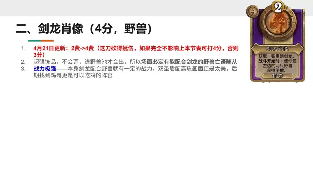 最典型的错误,就是在前期随从身材普遍偏小时使用它。一个2/3的随从,即便复制出1/1,对场面也几乎毫无影响,这相当于白白浪费了一次强化机会和金币。剑龙肖像是一张典型的中期发力牌,过早使用性价比极低。
