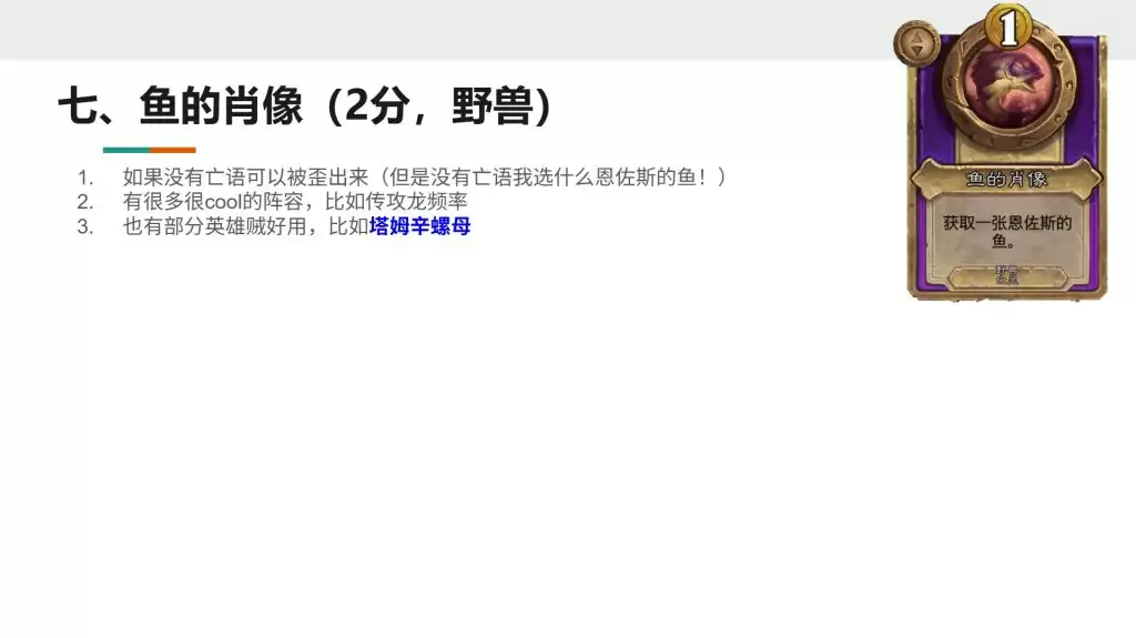 再来聊聊阵容搭配。毋庸置疑,肖像鱼是鱼人体系内的“发动机”组件。它与能生成额外资源的鱼人(比如“发现鱼”)、提供战吼 buff 的鱼人(比如“国王”)相性极佳,能形成“资源 -> 购买 -> 成长”的完美闭环。但值得注意的是,它与其他流派的核心配合度并不高,强行外设到机械或野兽体系里,收益往往不如一个体系内的优质单卡。