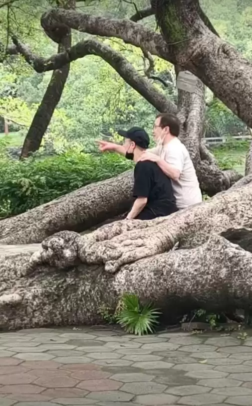尤其令人动容的是一张父子合影:成龙与房祖名并肩坐在一棵古树下休息,昔日的疏离感已荡然无存,画面中流淌着浓浓的亲情。43岁的房祖名身着黑色短袖,头戴同色棒球帽,简约装扮显得沉稳内敛。照片里,成龙的手自然地搭在儿子肩上,两人低头亲切交谈,眉眼间的亲密与默契,不言而喻。