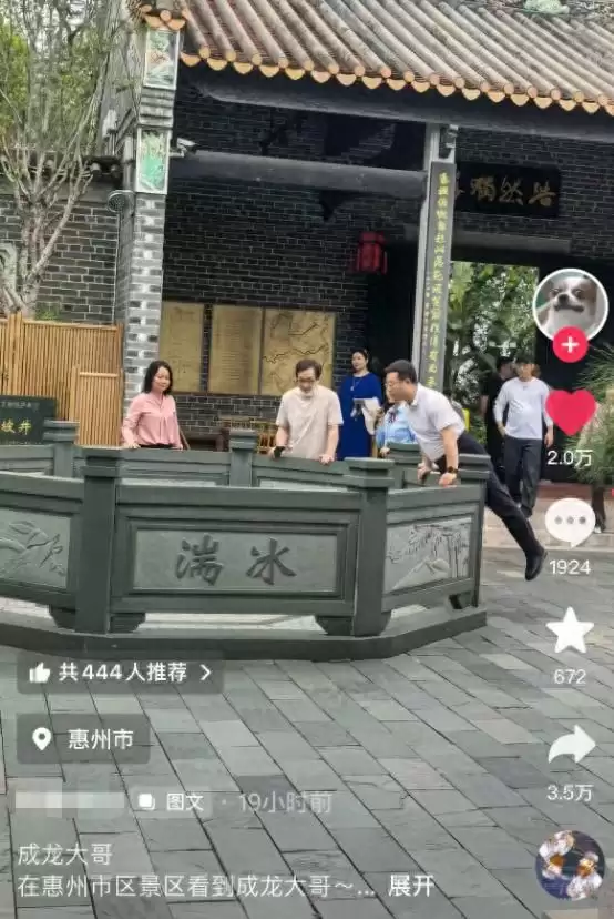 除了景区,还有另一位网友在惠州元妙观偶遇了成龙。据目击者描述,当时成龙身边虽有工作人员维持秩序,但得知这位享誉全球的功夫巨星现身,现场游客仍惊喜不已,纷纷举起手机拍照,记录下这难得的瞬间。