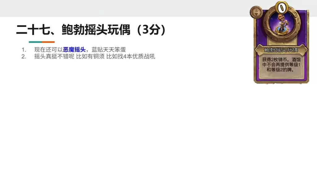 新版本上线,酒馆里最引人注目的新面孔,恐怕就是这位“鲍勃摇头玩偶”了。光看造型,一个会摇头晃脑的迷你鲍勃,趣味性直接拉满。但咱们都知道,在战棋里,趣味归趣味,强度才是硬道理。这个新伙伴到底能不能打?是锦上添花的玩具,还是能扛起体系的真核?今天就来好好盘一盘。
