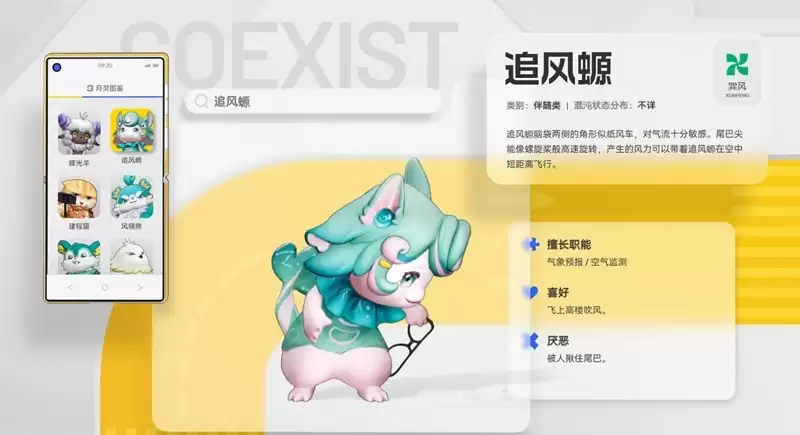接下来是追风螈,一位巽风属性的天气专家。看它头部两侧那对纸风车形状的角,就知道它对气流异常敏感。它的尾巴尖能像螺旋桨一样高速旋转,从而实现短距离飞行。它的本职工作是对天气和空气质量进行实时预报与监测,为你出行前提供精准的环境信息,非常实用。这位“风之子”喜欢飞上高楼,尽情享受气流拂过的快感。但切记,它非常讨厌被揪住尾巴,互动时保持尊重和适当距离是关键。