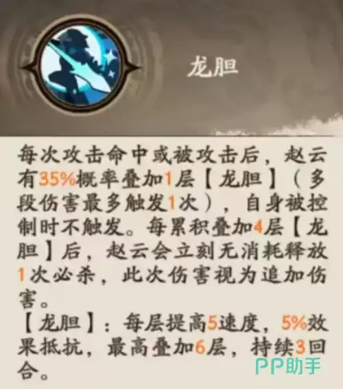 赵云强大的核心,源于其独一无二的天赋技能「龙胆」。该技能的触发条件直观高效:赵云每次进行攻击或受到攻击时,均有几率获得1层“龙胆”效果。当“龙胆”层数累积至4层时,将自动触发一次无需消耗资源、且无冷却时间的必杀技。尤为重要的是,此次必杀将被判定为追加伤害,可以完美继承所有提升追加伤害的增益效果,从而打出毁天灭地的爆发。