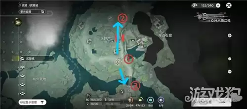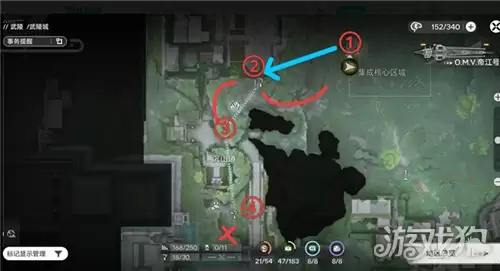然后是一步关键操作:沿着武陵石矿区的边缘绕到高处。选择放置点有个小窍门——最好能从这里直接望见血菌附近那个藏着宝箱的洞xue(也就是图中标记的“X”位置)。这个视野锚定法,能确保路线指向精准。