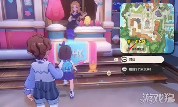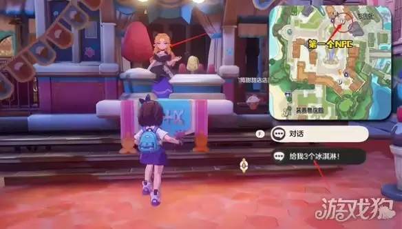 紧接着,从道具店向最右侧移动,在场景尽头你会遇到第二位关键NPC。与他对话将开启挑战,你需要成功使用道具捕捉3只【脆筒冰激凌】。