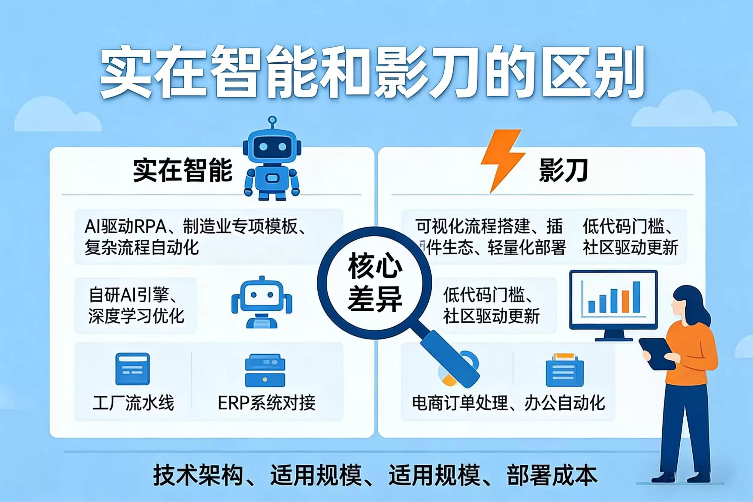 实在智能与影刀,作为国内RPA赛道上两位风格鲜明的选手,常常被放在一起比较。不少朋友在选型时也会感到犹豫。那么,这两者究竟有何不同?今天,我们就从核心定位、技术内核、演进逻辑和价值主张四个维度,进行一次深度拆解,帮你理清思路。