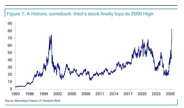 等了足足二十六年,英特尔股价终于再次触摸到2000年互联网泡沫时期的巅峰。然而,德意志银&行的一份最新研报,却给这场“王者归来”的戏码,泼上了一盆刺骨的冷水。报告警告称,在那些高贝塔值的科技明星股里,一旦选错了入场时机,你付出的代价,可能是一代人漫长的等待。