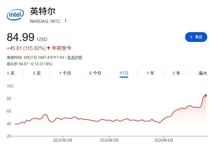 时间定格在2026年4月24日。这一天,英特尔股价不仅突破了尘封的历史高点,更以单日暴涨23.6%的惊人姿态,创下了自1987年10月以来的最大单日涨幅纪录。至此,其年内累计涨幅一度冲高至124%。