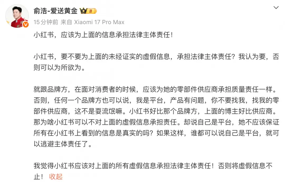 除了算法,俞浩将讨论延伸至更根本的平台责任层面。他随后再次发文,抛出了一个在数字时代极具代表性的问题:像小红书这样的内容平台,是否应该为其上未经证实的虚假信息承担法律上的主体责任?