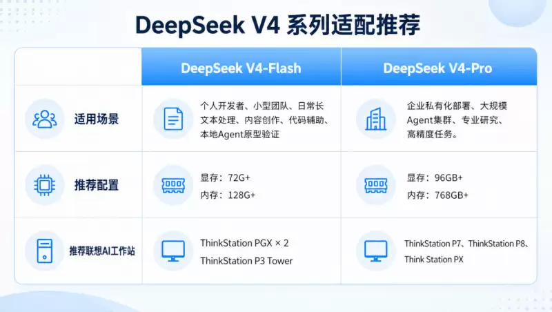 模型能力再强,也需要坚实的算力底座来承载。面向DeepSeek-V4的不同版本,联想AI工作站已经完成了全面适配。本地化部署的路径,变得前所未有的清晰。