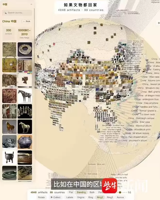 大英博物馆藏品数以百万计,仅中国文物就有数万件,全部展示并不现实。瑞贤最终精选出来自99个国家和地区的近5000件文物,以信息卡片的形式,“放置”在它们真正的故乡之上,让文明的光点覆盖整个地球。“例如,埃及的罗塞塔石碑,是破解古埃及象形文字的关键钥匙。再看中国区域,几乎被文物卡片铺满,从顾恺之的画作到其他众多国宝,清晰可见。”作品还设计了一个动画时间轴,展示藏品被大英博物馆获取的时间线,再次点击则能看到它们“回到”故乡的想象图景。“核心理念很简单,就是提醒人们:不要忘记那些不在自己国家的国宝。”