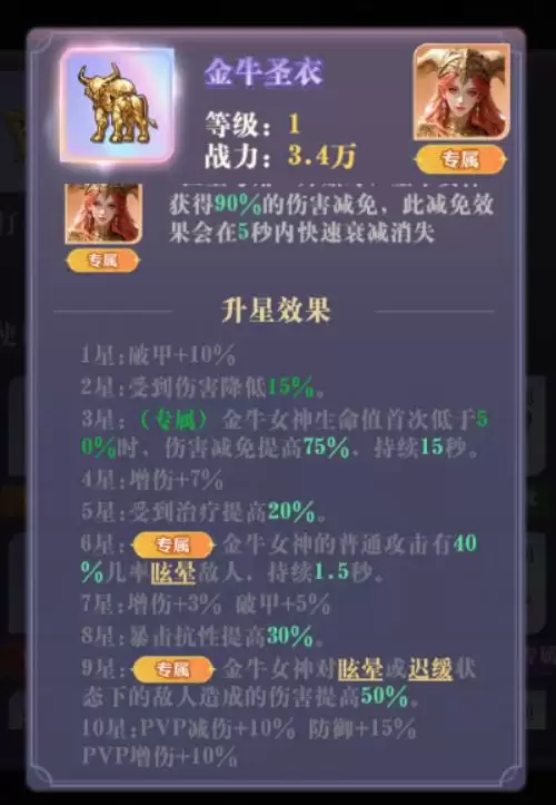 专属神器“金牛圣衣”完美契合其坦克定位。初始属性是在释放绝技时,获得90%的恐怖免伤,效果在5秒内衰减。虽然时间不长且会衰减,但这个初始数值已经是游戏内的天花板级别。