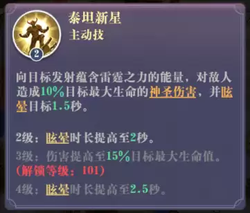 二技能是重要的控制兼伤害手段:对目标造成其最大生命值10%的神圣伤害(无视防御与免伤),并附带1.5秒眩晕。
