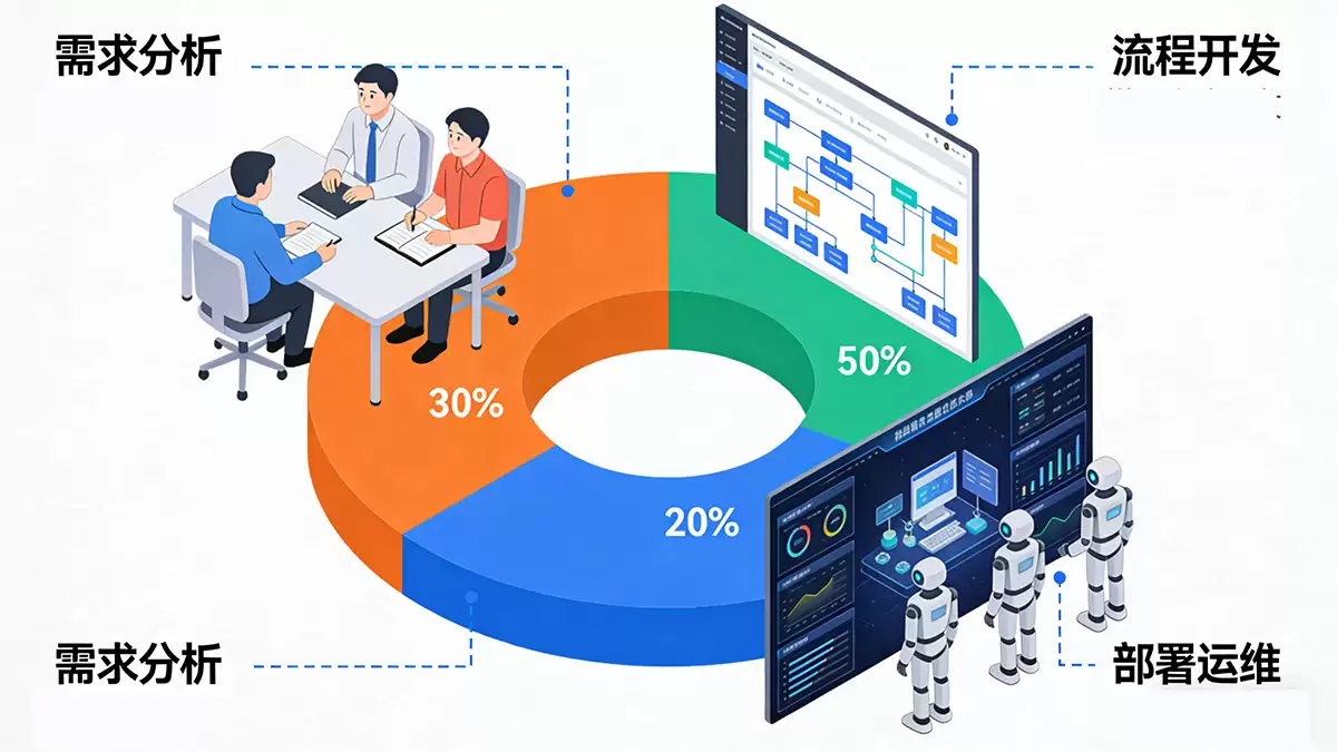 流程开发与测试(耗时约50%):在可视化设计器中“搭积木”,组合各类组件来构建流程,并进行充分的场景测试,确保机器人“听话又可靠”。