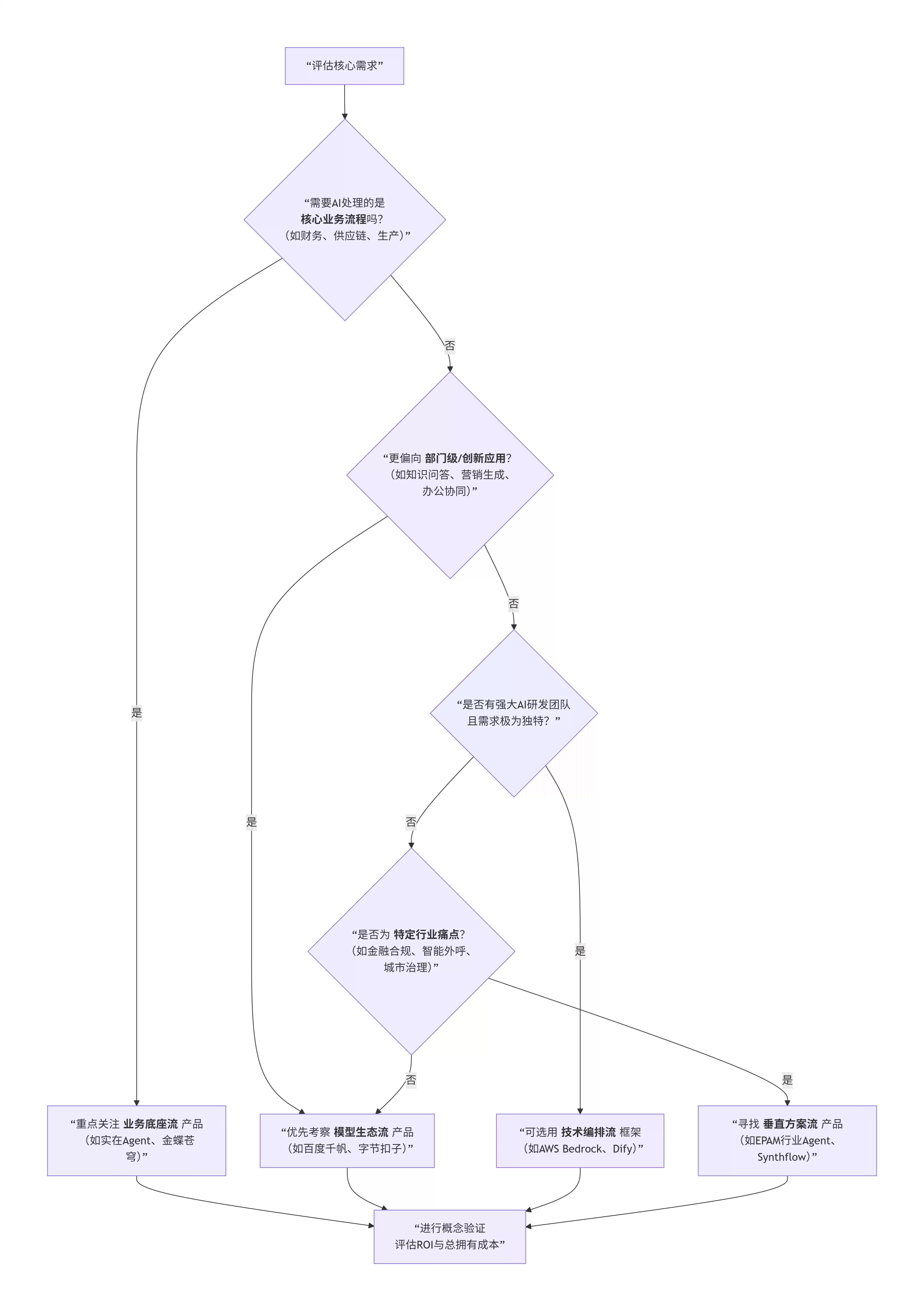 选择路径其实有章可循。首先,得在集成深度与灵活度之间权衡:业务底座流产品开箱即用,但与现有不同体系的系统集成可能需额外功夫;技术编排流则恰恰相反,前期投入大,但换来的是几乎无限制的灵活性与自主权。