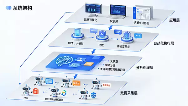 这一层由RPA机器人担纲主角,它的任务就是不知疲倦地自动抓取各大电商平台(如淘宝、京东、亚马逊)的用户评论数据。无论是评论内容、评分、时间还是用户ID,都能一网打尽。其优势在于支持多平台、多店铺的数据聚合,确保了分析源头的全面性。