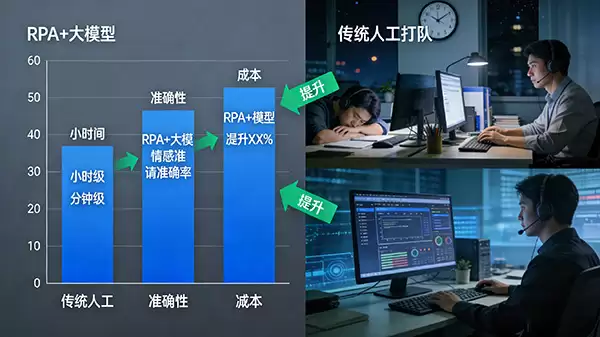 与纯人工操作相比,RPA+大模型的优势是全方位的: