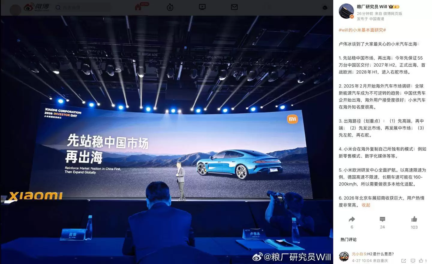 话说回来,小米为出海所做的准备,远不止于此。值得关注的是,在刚刚过去的2026年北京车展上,小米汽车展台收获了超高热度,招商工作也取得了突破性进展。这些来自一线市场的直接反馈,为未来的全球化运营积累了极其宝贵的经验。而此前,卢伟冰亲自在德国试驾小米SU7,为2027年进军欧洲做实地考察,更是将务实作风体现得淋漓尽致。如今,关键人才的到位与深入的市场调研同步推进,标志着小米汽车的出海战略,已经从蓝图规划迈入了实质性执行阶段。