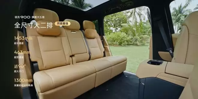 如果说外观是面子,那么内饰和空间就是里子,而这里恰恰是领克900大五座版大做文章的地方。内饰新增了“云绒粽”配色,质感上力求温馨高级。但真正的重头戏在于空间布局上的“魔术”:其二排中央通道被拓展至1453mm x 463mm,这是什么概念?意味着后排乘客的腿部活动空间极为宽裕,进出第三排(虽为大五座,但基础架构预留了空间感)也更为从容。不仅如此,车辆后备箱的纵深也提升到了1350mm,装载能力不容小觑。