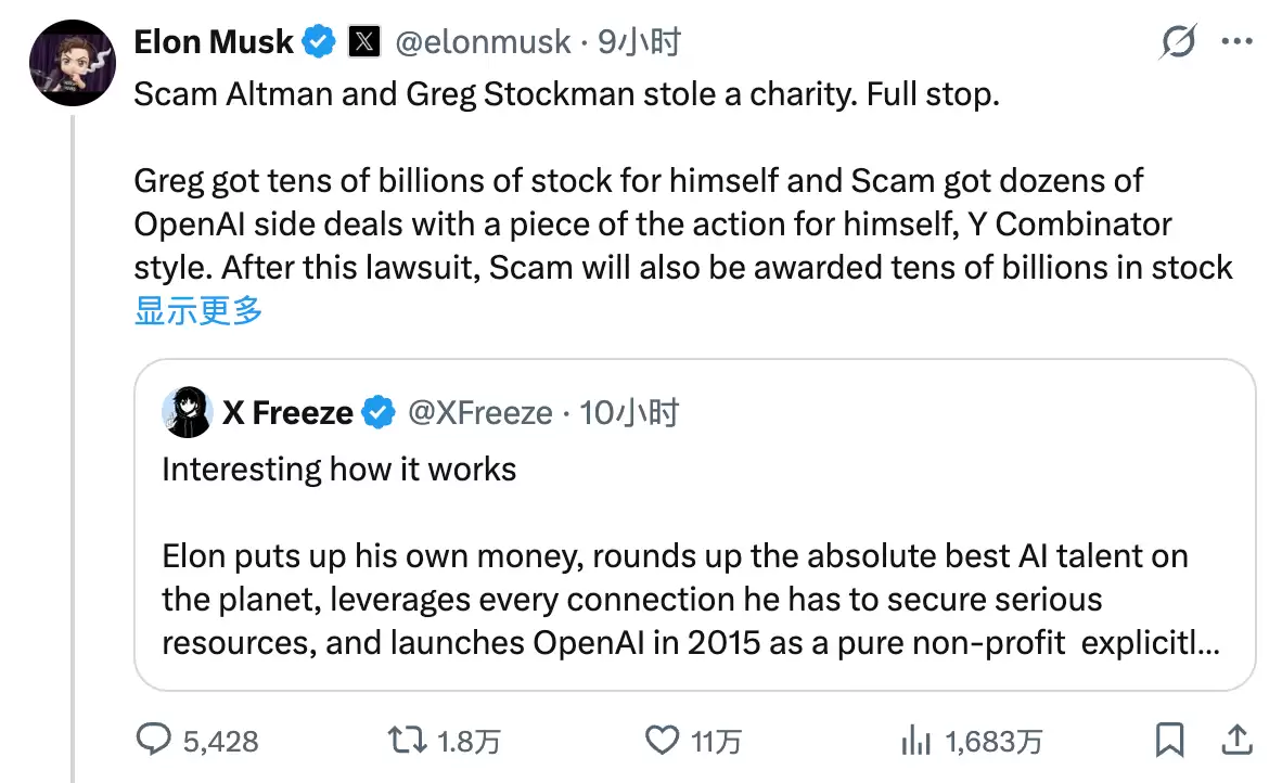 他在帖子中写道:“小偷格雷格给了自己数百亿美元的股权,反诈犯奥特曼也通过一堆类似Y Combinator模式的OpenAI关联交易为自己分了一杯羹(这场诉讼之后,他还会直接再拿到数百亿美元的股权)……我本可以一开始就把OpenAI做成一家营利性公司,但我没有。我创立了它,为它提供资金,招募关键人才,并把我所知道的一切关于如何打造一家成功创业公司的经验都教给他们——这一切,都是为了公共利益。然后,他们把这个慈善机构偷走了。”