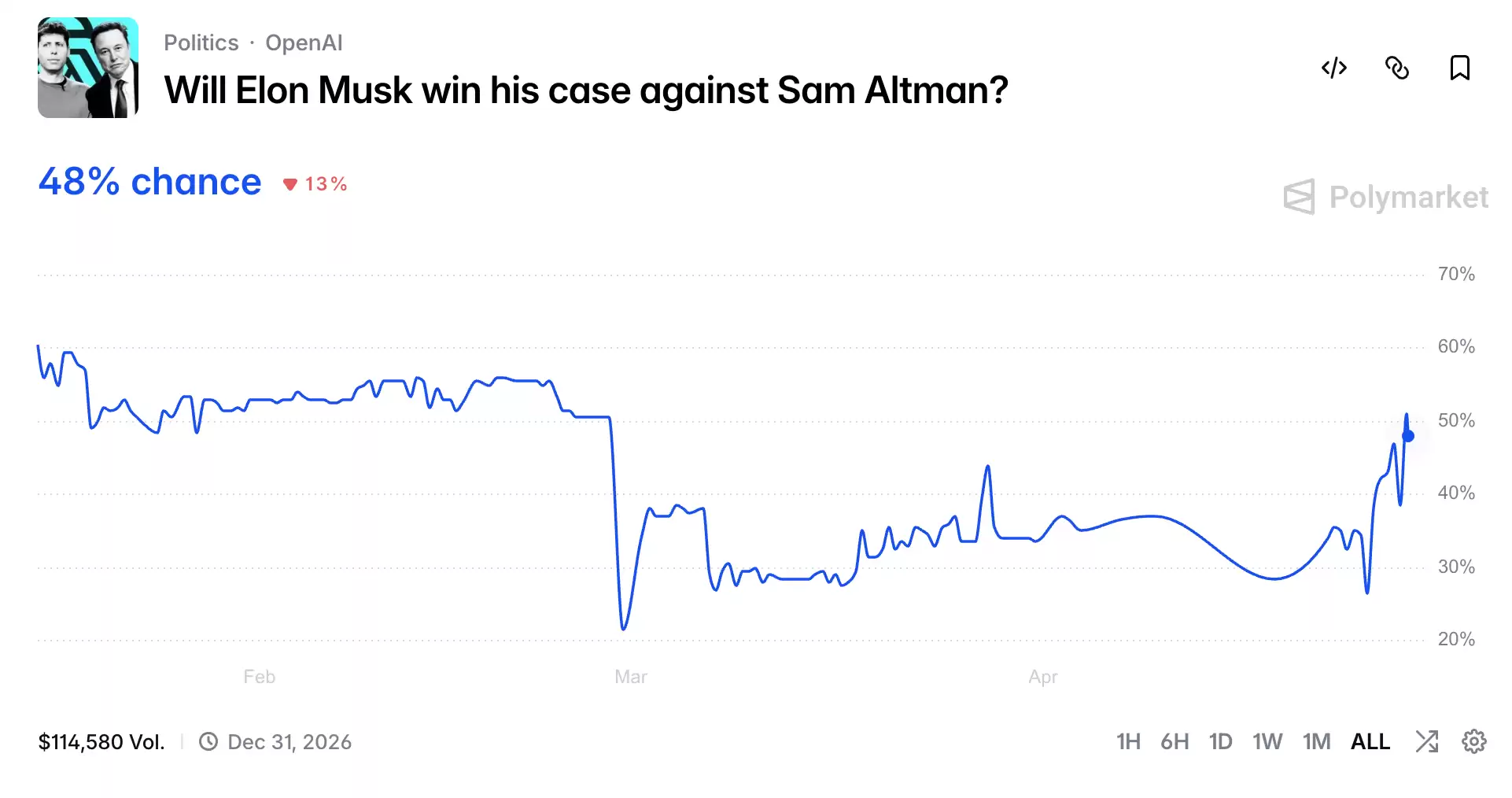 庭审的启动也迅速反映在了预测市场上。在Kalshi、Polymarket等平台上,相关预测合约已经上线。目前,市场认为双方胜诉几率几乎旗鼓相当,马斯克方的胜率暂报48%,局势仍充满变数,有待庭审动态更新。