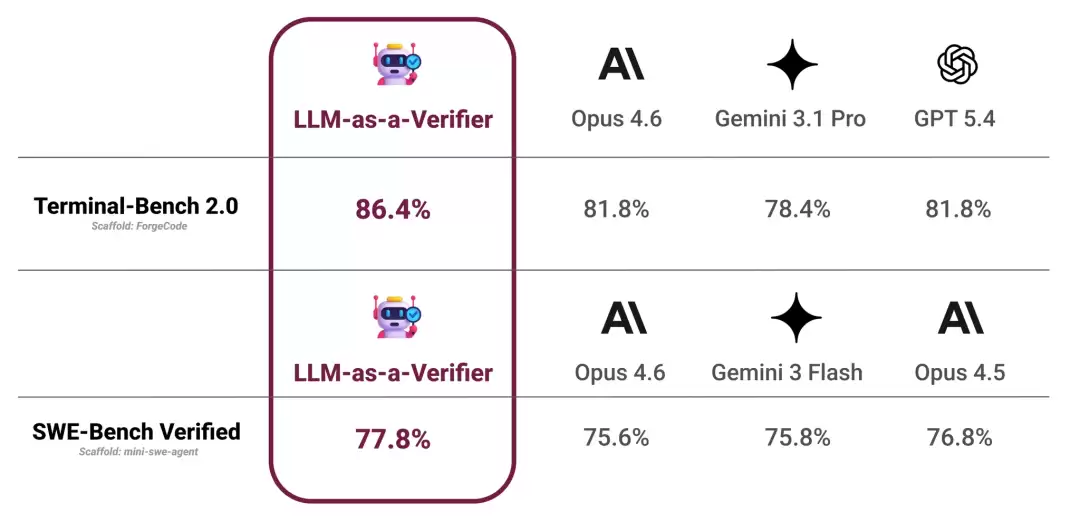 目前,LLM-as-a-Verifier在AI编程领域的两个重量级基准——Terminal-Bench和SWE-Bench Verified上,都拿下了当前最优的性能。
