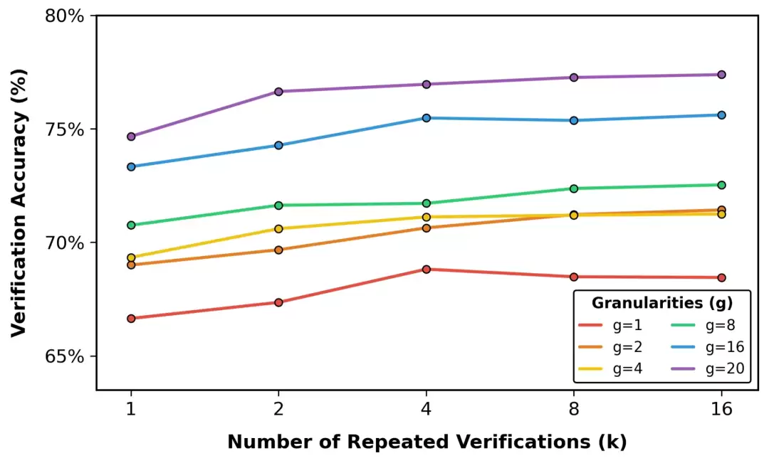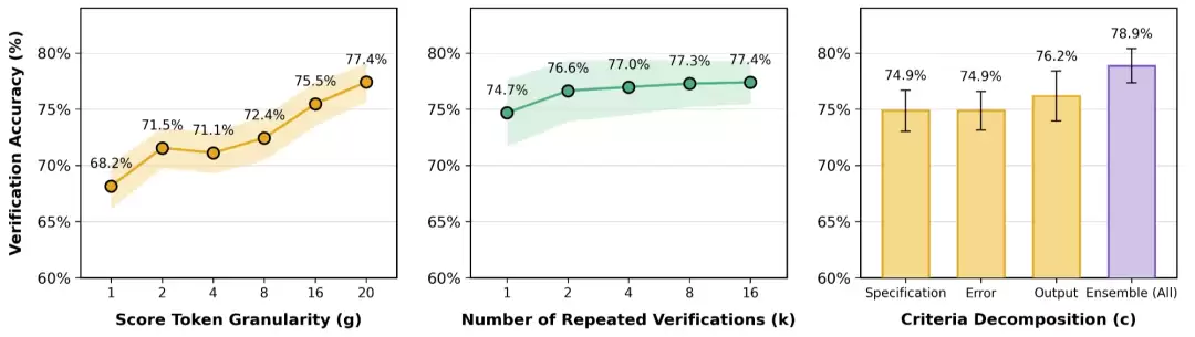 进一步的实验揭示了性能提升的来源:增加评分标记的粒度,或者提高重复验证的次数,都能显著拉升验证准确率。特别是在将评分粒度从1级细化到20级的过程中,量化误差被大幅压缩,使得评估结果更接近真实的奖励分布。