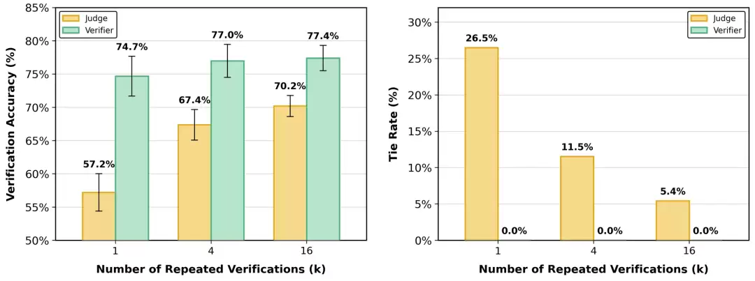 对比传统的LLM-as-a-Judge,LLM-as-a-Verifier在验证准确率和消除平局两方面优势明显。即便把传统方法的重复验证次数增加到16次,Verifier依然能保持至少7个百分点的准确率优势,并且彻底杜绝了平局现象。