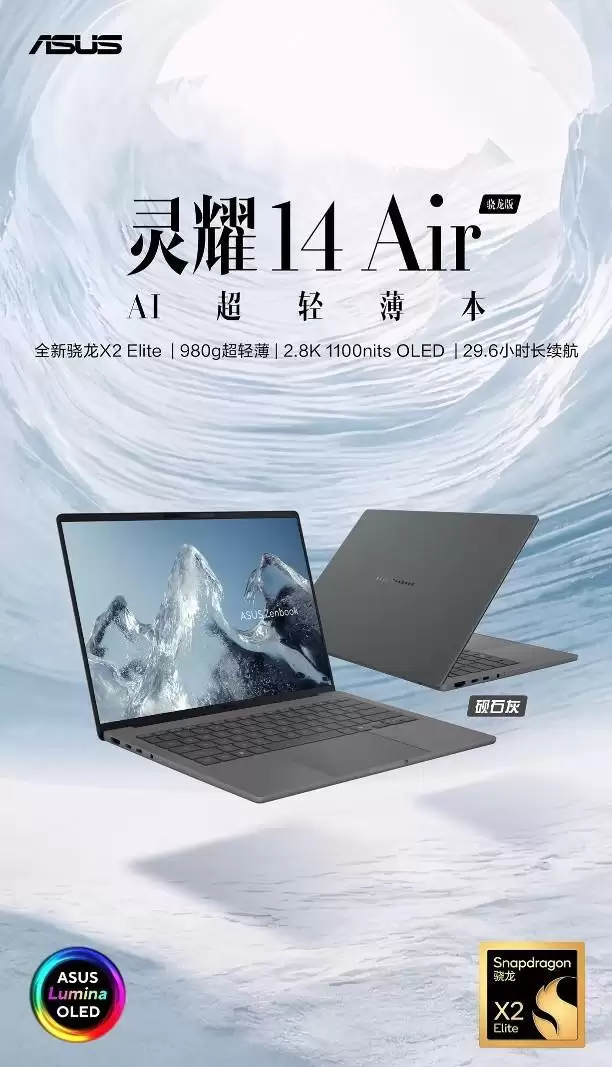4月27日,华硕正式推出了搭载骁龙X2 Elite系列平台的AI PC三剑客,分别是针对旗舰大屏市场的灵耀16 Air骁龙版、主打极致移动办公的灵耀14 Air骁龙版,以及面向专业创作者的二合一设备ProArt创X 2026。