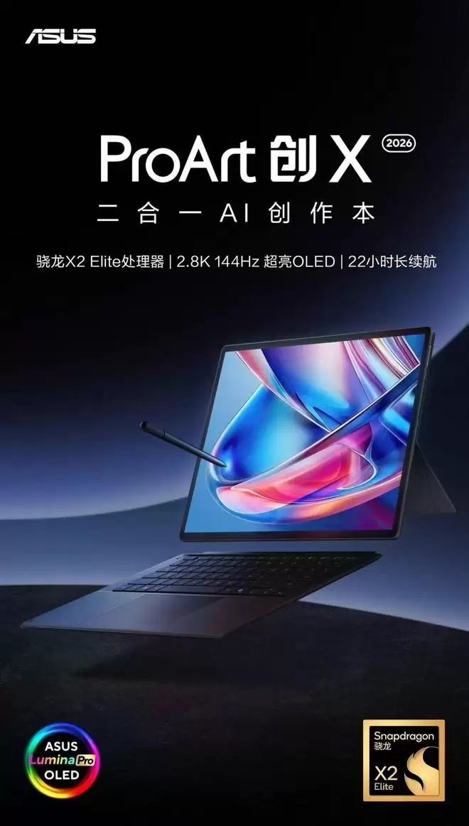 如果说16 Air是全能旗舰,那么灵耀14 Air骁龙版就是“续航卷王”。它在维持980g极致轻薄机身的前提下,凭借骁龙X2 Elite平台的能效优势,竟实现了最高29.6小时的续航时间,几乎重新定义了同级别产品的续航标杆。而面向专业用户的ProArt创X 2026,则延续了该系列对色彩与形态的极致追求。820g的二合一机身内,配备了一块峰值亮度达1000nits、支持144Hz刷新率的2.8K OLED触控屏,并辅以AR抗反射涂层,直指户外创作者最头疼的屏幕反光与视觉干扰问题。