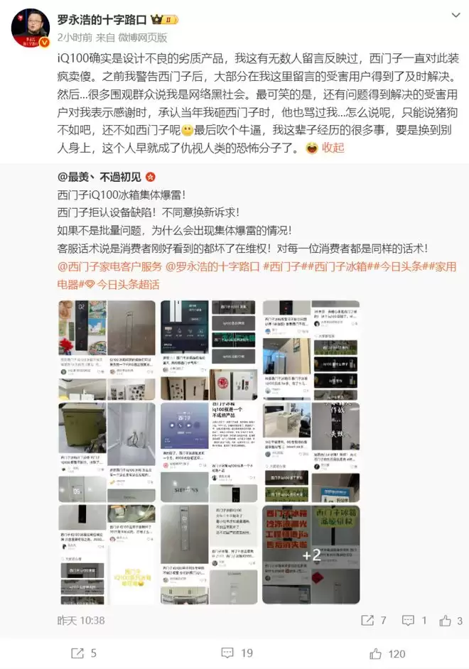 事实上,这并非罗永浩首次就此问题发声。回溯到2025年7月,他就曾因这款冰箱的结霜、不制冷问题公开喊话西门子,要求其正视并解决缺陷。当时,他晒出了大量用户反馈,试图证明结霜问题是普遍现象,而非个别案例。但西门子的回应呢?依旧是那套熟悉的“组合拳”:态度含糊,不承认设计问题,只承诺提供上门检修服务。这种处理方式,在外界看来,多少有些治标不治本、敷衍了事的意味。