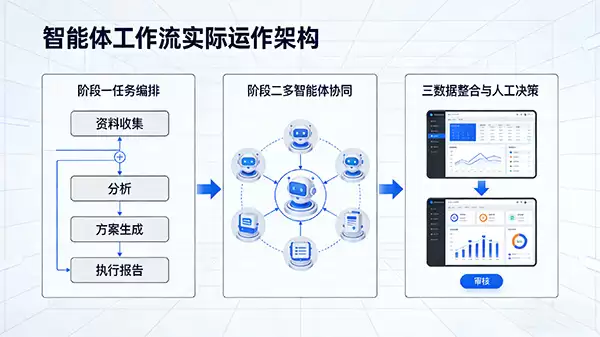 阶段三:结果整合与人的决策。 所有任务执行完毕后,系统会对分散的数据和成果进行整合与呈现。最终,由人类进行审阅、判断并做出最后决策,从而在自动化的同时,确保结果的质量与可控性。