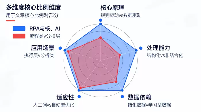 决策层级: RPA在指令下操作,处于执行层;AI可分析判断,处于认知层。