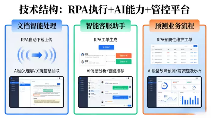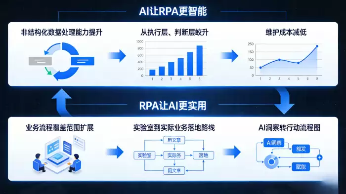 如果说传统RPA是“自动化的手脚”,那么AI就是为其装上了“眼睛和大脑”。AI赋予RPA处理发票图片、理解客户邮件等非结构化信息的能力,使其从简单的流程执行,跃升为能进行初步判断的智能体。更重要的是,当业务流程发生微小变动时,AI可以帮助RPA理解和适应,大幅降低后期维护和调整的成本。