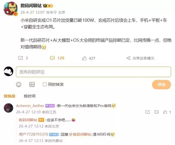 随后小米玄戒O1出货量超百万就成为全网热议的焦点所在,大家都在讨论这个事情。与此同时行业人士表示小米玄戒芯片后续会上车,也就是小米会打造“汽车+手机+平板+智能穿戴设备”全生态布局,且这个全生态都会用小米自己自研的玄戒处理器。他还表示:新一代玄戒+AI大模型+OS大会师的产品排期已定,但会比网传的晚一点,不过非常值得期待。这是一款什么样的产品,这才是行业最关注的点所在。毕竟全系都是小米自研的,从内到外都是如此。自研核心处理器、自研操作系统、自研AI大模型,就凭这几点大家说期待不期待。