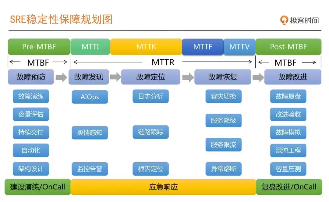 - 明确目标:一切围绕“提高MTBF + 降低MTTR”展开,用SLI/SLO/Error Budget作为量化指引。