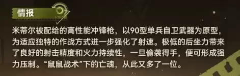 提到这把枪的数据,最直观的感受就一个字:快。它以90型单兵自卫武器为基础进行改造,开发方向完全针对米蒂尔的作战风格做了专项强化。后坐力控制得相当出色,持续输出时枪口稳定,精度保持得很好。配合米蒂尔那套擅长近身游袭的战术,一旦让她切入理想位置,这把枪的压制力会非常显著,对手想轻松脱身可没那么容易。
