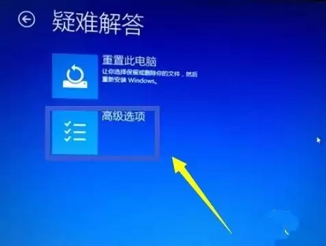 第六步:紧接着,在疑难解答页面中,继续选择“高级选项”。