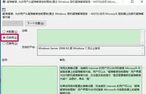 分别双击这两项策略,在弹出的设置窗口中,将左上角的选项从“未配置”或“已禁用”更改为“已启用”,然后依次点击“应用”和“确定”保存更改。这一步,相当于手动为疑难解答功能打开了“绿灯”。