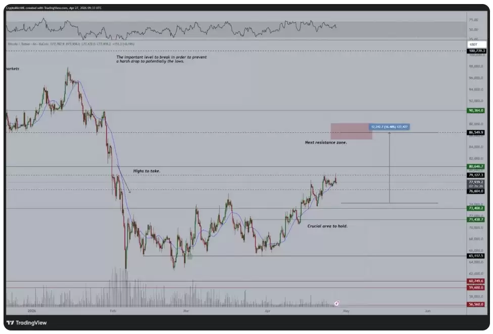 市场情绪总是瞬息万变。就在本周一,比特币经历了一次“闪崩”,价格在一小时内从79,000美元急挫至76,000美元。不过到了周二,它又稳在了76,900美元附近。波普在他个人的TradingView频道分享了一张图表,并解释道,比特币的上涨动能其实正在积聚。“市场仍然具备进一步上行的潜力,而且关键支撑位目前守得很稳。”他在分析中这样写道。