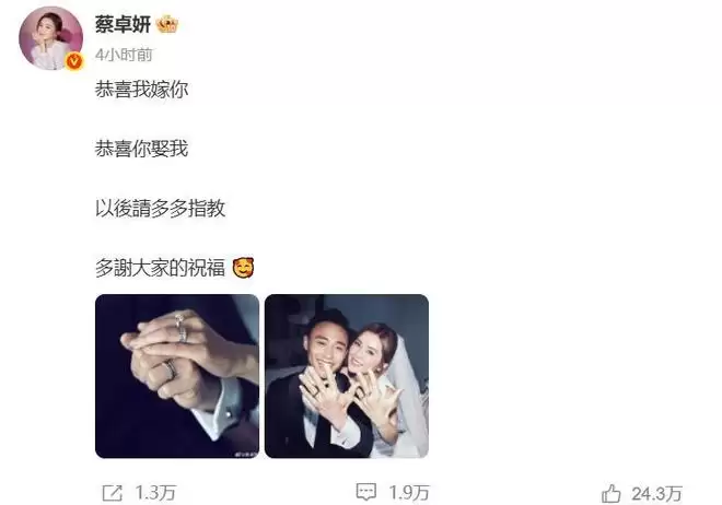 在个人社交账号上,蔡卓妍难掩喜悦,亲自与大家分享这份幸福。