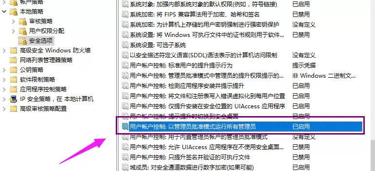 这时,右侧会显示一长串策略列表。你需要找到其中名为【用户账户控制:以管理员批准模式运行所有管理员】的这一项。找到后,右键点击它,选择【属性】,会弹出一个新的设置窗口。
