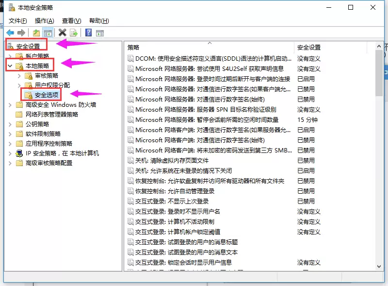 接下来,系统会打开【本地安全策略】管理器。在这个窗口里,你需要依次展开左侧的树形目录:【安全设置】>【本地策略】>【安全选项】。
