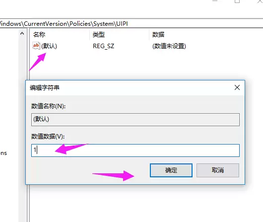 选中【UIPI】后,看右侧窗口。这里通常有一个“默认”的字符串值。双击它,将其数值数据也修改为【1】。