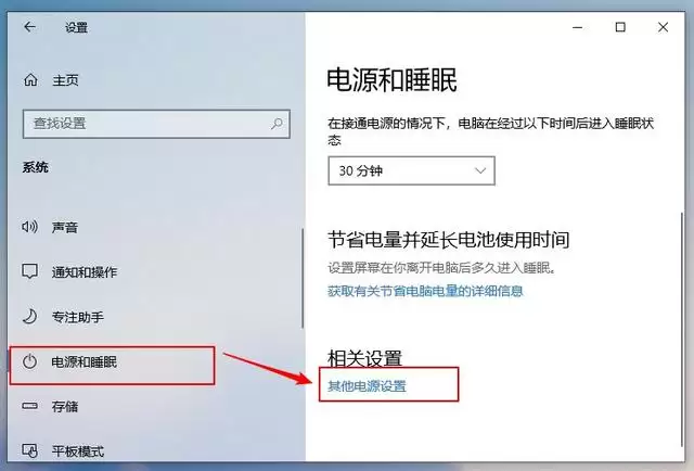 第二步,进入系统设置后,看左侧的菜单栏,选择“电源和睡眠”。这时,右侧界面会显示相关设置,在其中找到并单击“其他电源设置”。