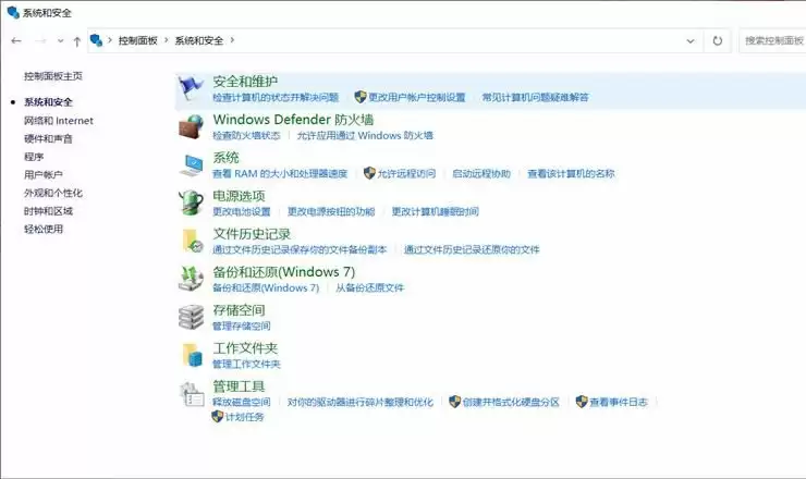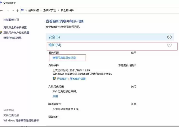 3. 在新窗口中,点击【安全和维护】,然后展开“维护”选项,就能看到【查看可靠性历史记录】的链接了,点击它。
