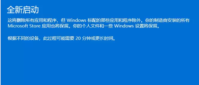 在打开的界面中,你可以选择“保留我的文件”或“删除所有内容”。需要注意的是,如果选择“删除所有内容”并进入更多设置,其中有一个选项叫“全新启动”。