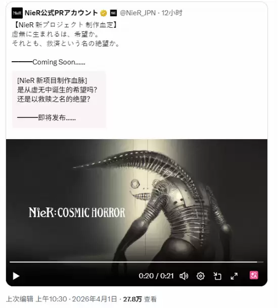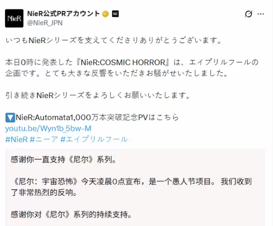 今年愚人节,游戏圈的整活氛围可谓拉满了。之前咱们报道过的《尼尔》系列发布“新作预告”这事儿,现在官方终于揭晓了谜底:这纯粹是一个精心策划的愚人节玩笑。想了解整个事件的来龙去脉?可以点击查看星空专题页面,那里有完整的事件发展时间线。专题链接>>