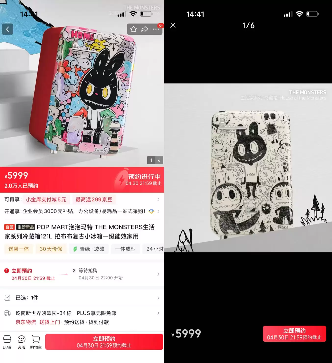 预约通道先挤爆了——这是泡泡玛特Labubu主题限量冰箱上市前的真实写照。Home款和House of the Monsters款,双版本,全球各限量999台,每激进分子立编号,定价5999元。4月30日正式开售,但热度早已溢出:仅京东平台合计预约人数就突破了2.8万,闲鱼上的黄牛价已经挂到了8999元,溢价整整3000块。