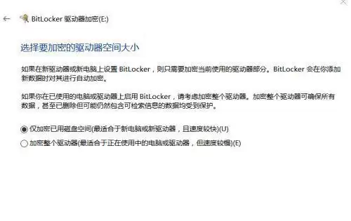 然后,系统会询问加密的空间范围。这里有两个选项:“仅加密已用磁盘空间”速度更快,适合新盘或空闲空间多的磁盘;而“加密整个驱动器”更彻底,但耗时也长。根据你的实际情况选择即可。
